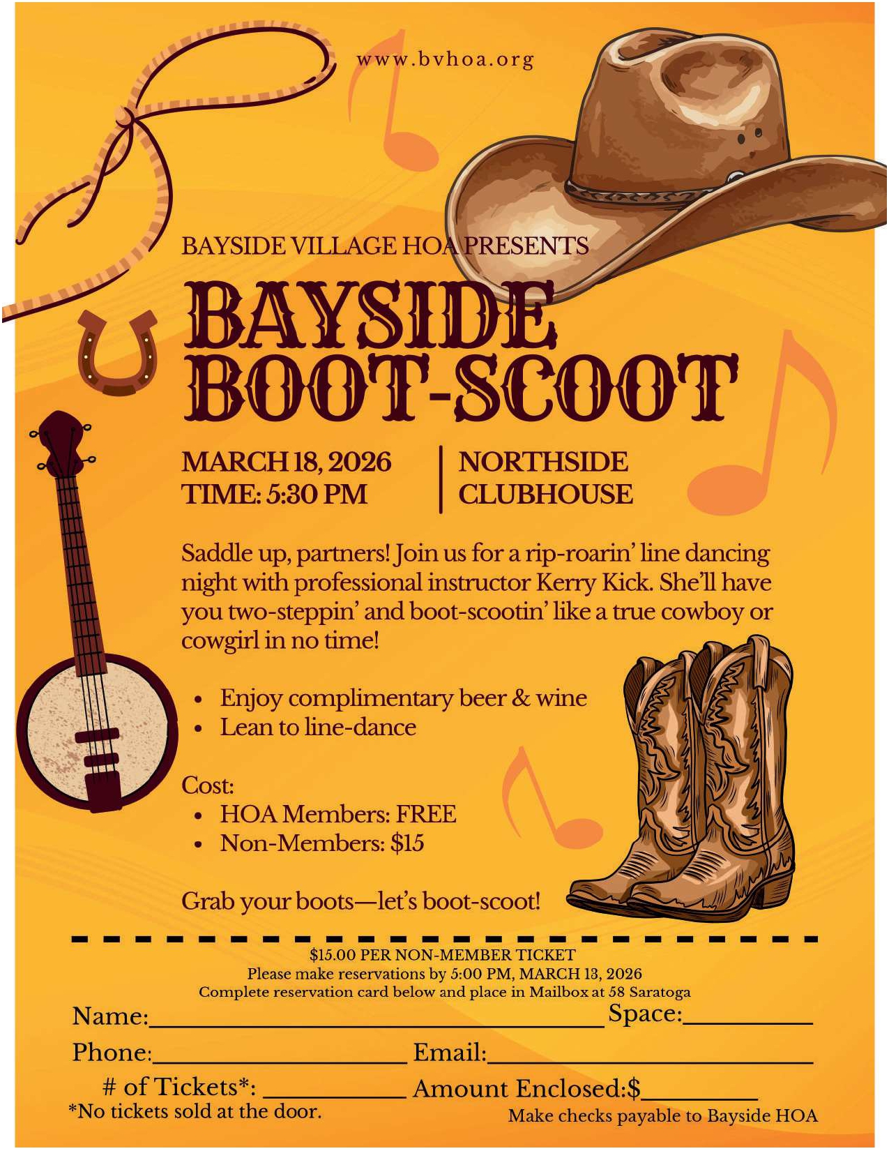 | Wed., March 18, 5:30 pm | Bayside Boot-Scoot Line Dancing | NCH | HOA |